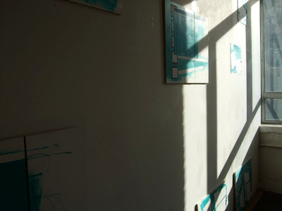 Keeping up with postings of pictures from the studios of the Elizabeth Foundation for the Arts, here are pictures from Jimbo Blachy's studio, with pictures of his boat in progress that he is working on with his often time collaborator Lytle Shaw. Also from the 9th floor, Marjorie Welish. In Majorie's studio light reflects on blue and rectangles. Observation: artists on the street side of the building are affected by the light, the space of it and they like blue, see Jane Kent's post, "Tinged in Blue." Back to working on the fixins.